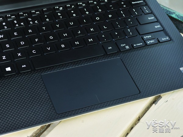 由上图可见全新戴尔XPS 13采用的是现在非常流行的LED背光键盘,而且值得一提的是该机的键盘键帽表面经过了类肤质涂层的处理从而使点触的手感更好。该键盘的回弹速度也非常不错,小编在使用的时候也没有发生卡顿或者连触的情况。