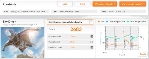 全新戴尔XPS 13在3D Mark Sky Diver模式下跑出的成绩为2683分,相比较PC Mark的得分XPS 13在这块的表现较为普通。不过话又要说回来,如此超薄的笔记本,你还要怎样啊!