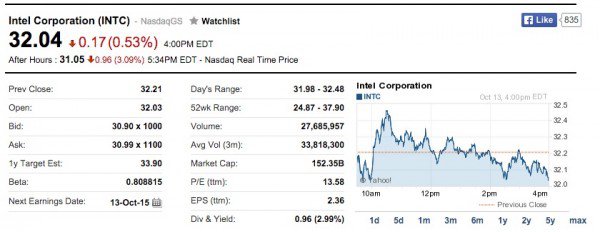 英特尔今天公布财报称,其第三季度净利润同比下滑6.3%,原因是PC需求继续表现疲弱。对于当前的第四季度,英特尔预测其营收为148亿美元,上下浮动5亿美元。汤森路透调查显示,分析师平均预期其第四季度营收为148.3亿美元。这家半导体巨头的股价在过去一年时间里上涨了1.8%。财报公布后,其股价上涨2美分,至32.06美元。