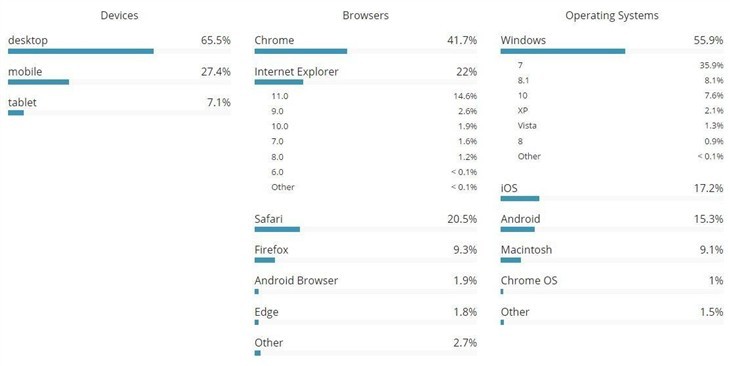 根据系统分布显示,iOS设备位居地第二,占比为17.2%,而苹果桌面操作系统OS X的占比为9.1%。根据浏览器分类结果显示谷歌Chrome浏览器流量占比为41.7%,随后是IE浏览器,占比为22%,其中IE 11占比为14.6%,9.0版本排第二,占比为2.6%,不过除了IE 11之外这些旧IE浏览器将于本周停止支持,所以推荐用户尽快升级。Safari浏览器位居第三,占比为20.5%,而Firefox浏览器占比仅为9.3%。■