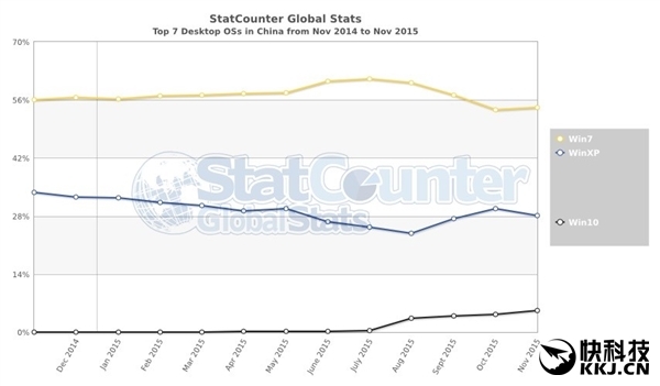 Windows 7前五个月也是一直在换换增加,始终略高于56%,然后突然爆发,七月份的时候达到了61.09%的历史新高,不过随后又急剧下跌,十月份的时候降至53.56%,但是十一月又回升了一点点。