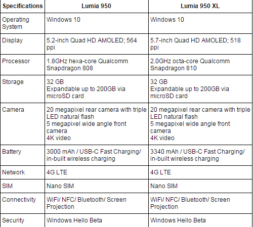 除了这个让商务用户惊喜的功能之外,这两款新机的配置之高也是让人意外。其中,Lumia 950配置5.2英寸2K屏幕,2000万像素后置镜头,三色温闪光灯,500万像素前置镜头。高通骁龙808处理器,3GB内存,32GB内置存储,3000mAh电池,支持Qi无线充电和NFC以及快速充电。