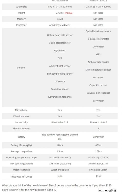 根据泄露的信息,微软将Band2当中加入了Barometer(气压计)这样一款传感器,电池升级为锂聚合物。似乎用了第三代康宁大猩猩玻璃。虽然没有处理器和内存信息,但相比上一代应该有所提升。