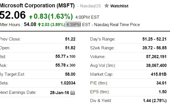 在1月28日的常规交易中,微软股价上涨0.83美元,收于52.06美元,增幅1.63%。在盘后交易中,截止美东时间28日下午4点39分(北京时间29日上午5点39分),微软股价上涨2.03美元,涨幅3.89%,达54.08美元。在过去52周里,微软股价介于39.72至56.85美元。(编译/虎涛)