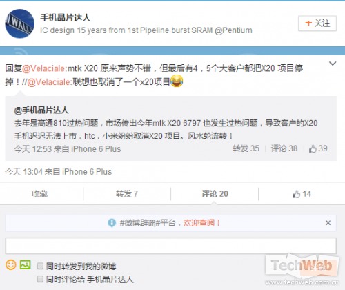 【TechWeb报道】之前红米Note 3曝出的Wi-Fi断流问题,就是联发科Helio X10 MT6795所引起的,在米粉的吐槽声中,小米直接对这款处理器几乎失去信心,祸不单行,已经传闻很久将在今年正式亮相的Helio X20,被@手机晶片达人爆料,也是出现了发热严重问题,一些产品的发布时间也因此一推再推。