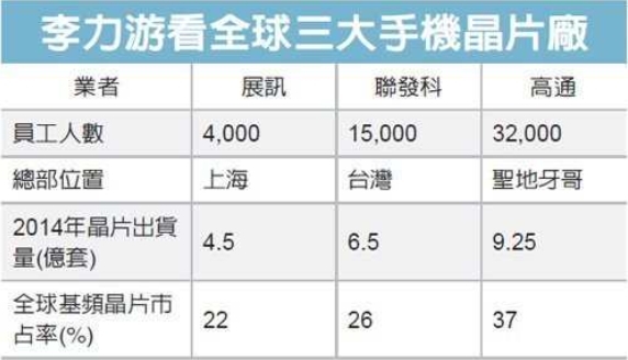 然而这组数据还不能说明问题啊,展讯的出货量还是比不过高通和联发科。所以,李力游亮出了第二组数据:展讯员工只有4000名,远不如联发科1.5万人和高通3.2万人,而去年出货量分别为4.5亿、6.5亿和9.25亿套。 言下之意,员工规模不再一个量级上,展讯芯片的出货量依然在逐渐接近高通和联发科。此外,他还豪言,5G市场不会再落后与联发科核高通。