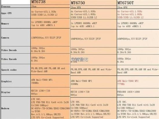 而稍高端的MT6750和MT6750T的基本参数基本一致,均为八核处理,配备了四个1.5GHz和四 个1.0GHz的Cortex-A53处理核心,GPU为Mali-T860 MP2,最高支持1600万像素摄像头、4GB运存。而网络方面与 MT6738一致,最高支持Cat.6 LTE网络。当然,与MT6750相比,MT6750T还是略有升级的,最高屏幕分辨率支持1920×1080, 并且GPU频率预计也将更高。(按这意思,难道4GB RAM有望普及?)