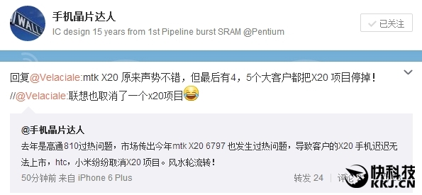 @手机晶片达人 称小米、HTC已经纷纷取消了X20手机项目,但要做首发的乐视暂不清楚。