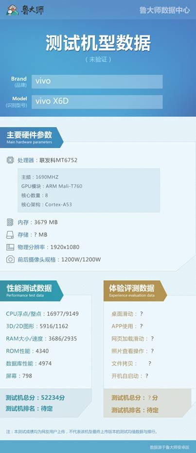 下面我们来看看鲁大师给出的代号为vivo X6D的详细配置跑分信息: