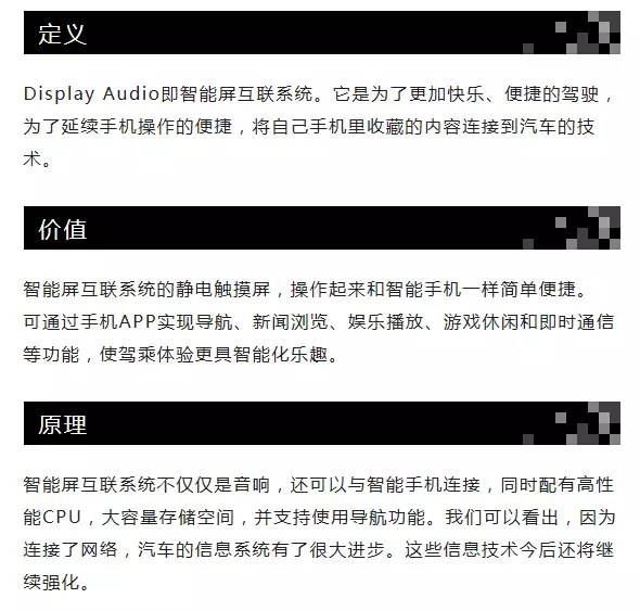 DA智能屏互联系统,可以把手机等移动终端连接到汽车上,最大的亮点在于可以通过WiFi与IOS和android手机系统进行连接,手机上的操作和显示,可以镜像投射到汽车内部大尺寸显示屏上,操作起来更加方便快捷。除了支持播放音乐外,还能扩展导航、游戏休闲等多种应用,汽车俨然就是你的智能互联中心。