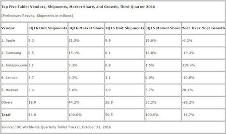 根据外媒报道,市场研究机构IDC最新发布了一项报告,该报告称,2016年第三季度全球平板电脑出货量仅为4300万部,而去年同期为5050万部,同比下跌14.7%。这已经是平板电脑市场出货量连续下降的第8个季度。