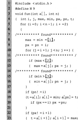 1、下列给定程序中,函数fun的功能是:把形参a所指数组中的最小值放在元素a[O]中,接着把a所指数组中的最大值放在a[1]元素中;再把a所指数组元素中的次小值放在a[2]中,把a所指数组元素中的次大值放在a[3],依此类推。