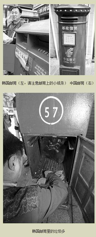 一名来自北京的中国游客表示,与中国邮箱不同,韩国邮箱为方形、红色,还分两个口,很容易让人联想到垃圾桶。如果没有中文标识,一个不注意说不定还真就当成垃圾桶了。